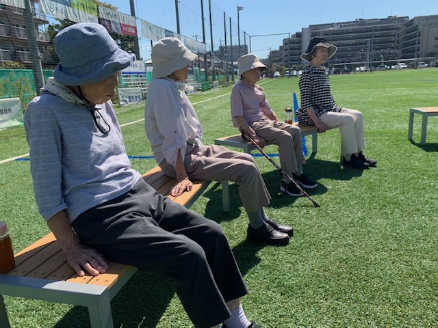 体操部は青空のもと、開放感あふれるスタジアムでボール体操などを頑張っています。