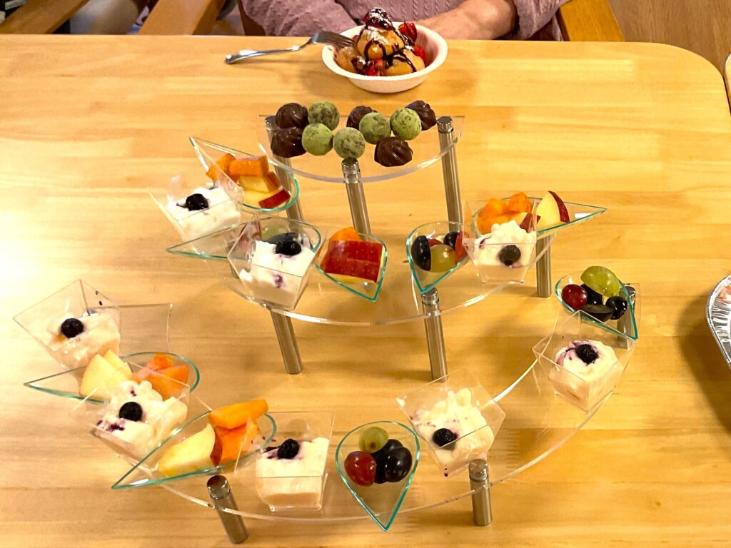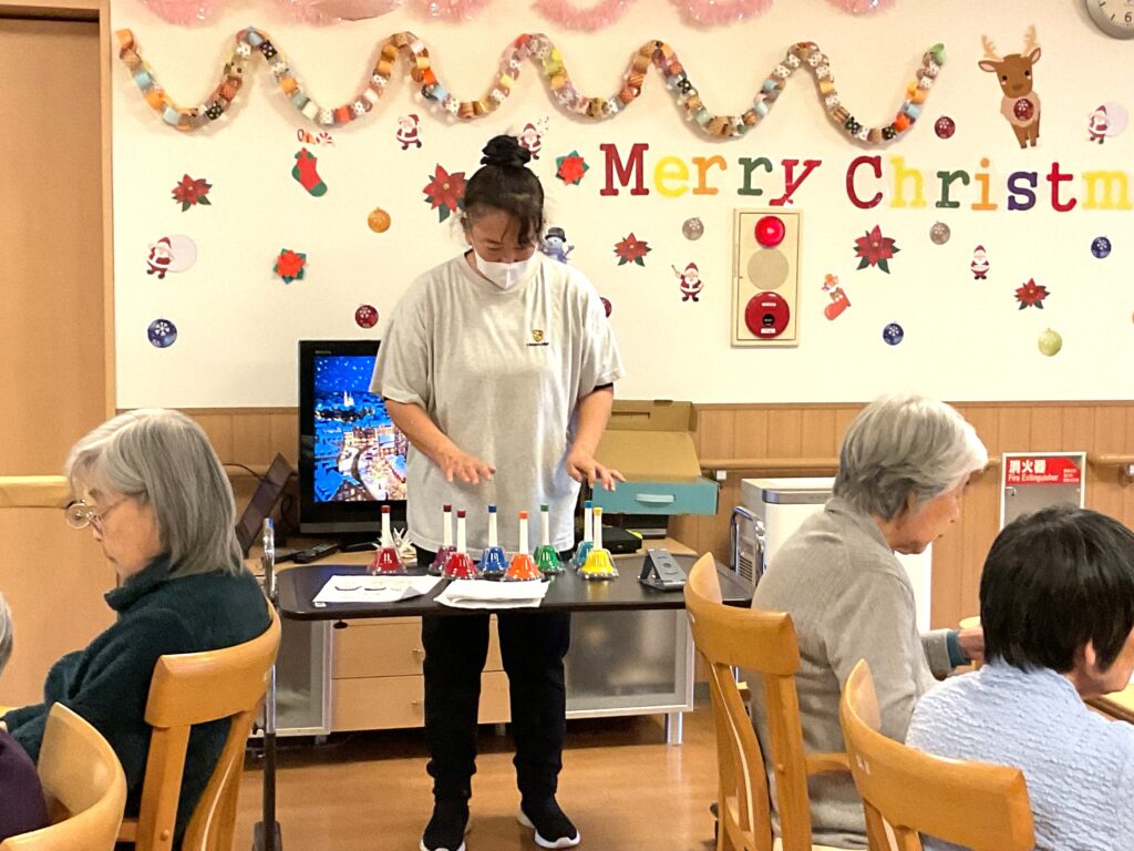 午後はハンドベル演奏に合わせて歌やボーリングゲームで盛り上がり、アフタヌーンティー風なおやつを楽しみました。