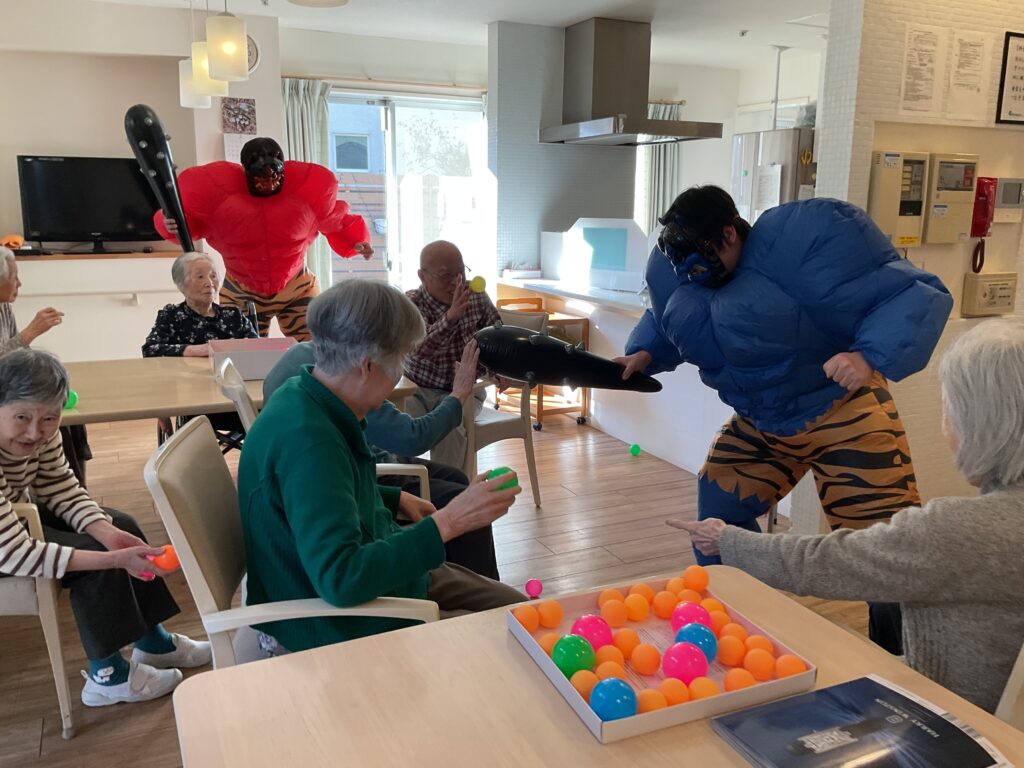 手にしたボールを思いっきり鬼たちにぶつけて楽しんでいらっしゃいました。