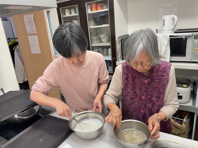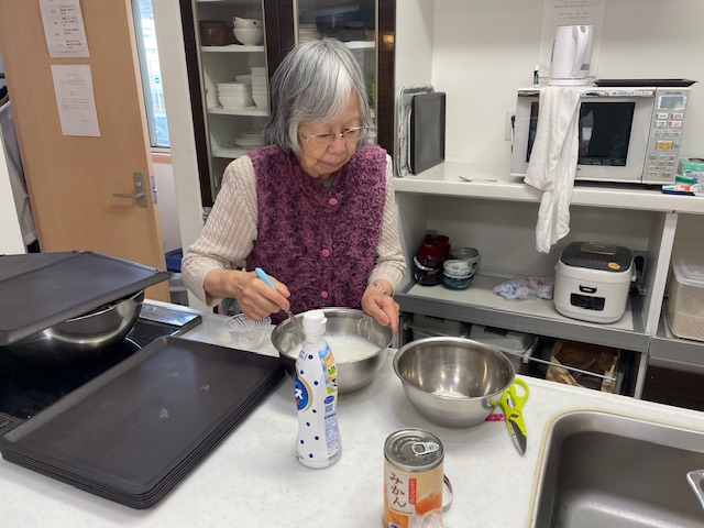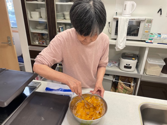 「美味しく作れるかしら」「もう少し混ぜた方がいいよ」等お話ししながら作っておりました。