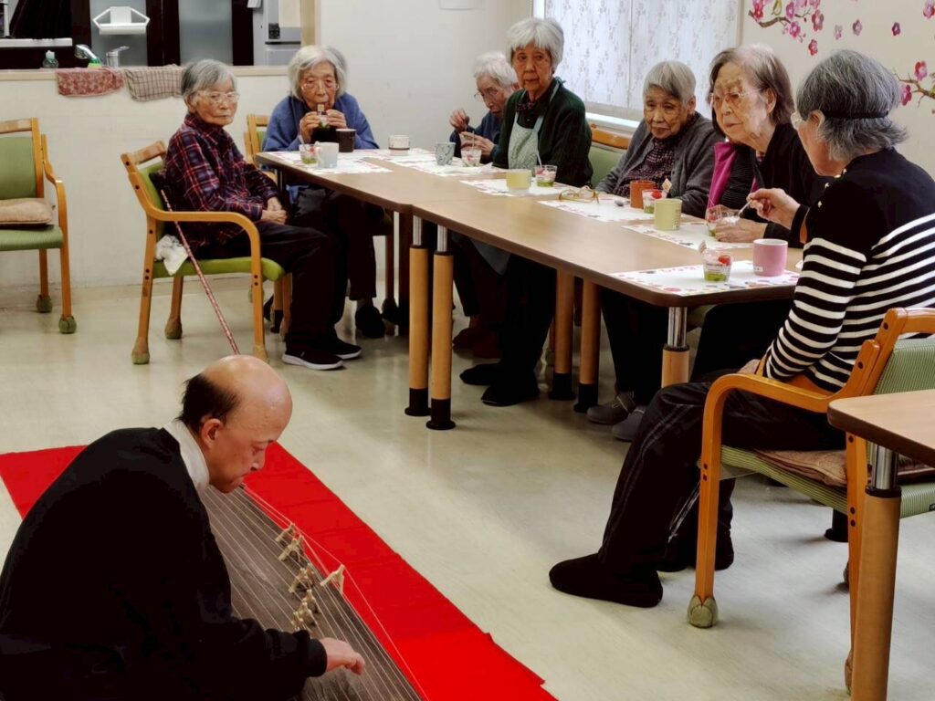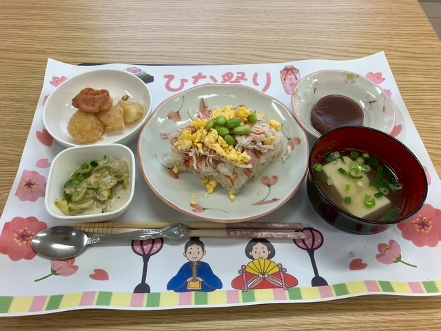 皆さんにお雛様に変身していただき、昼食はちらし寿司、スタッフによるお琴の演奏、