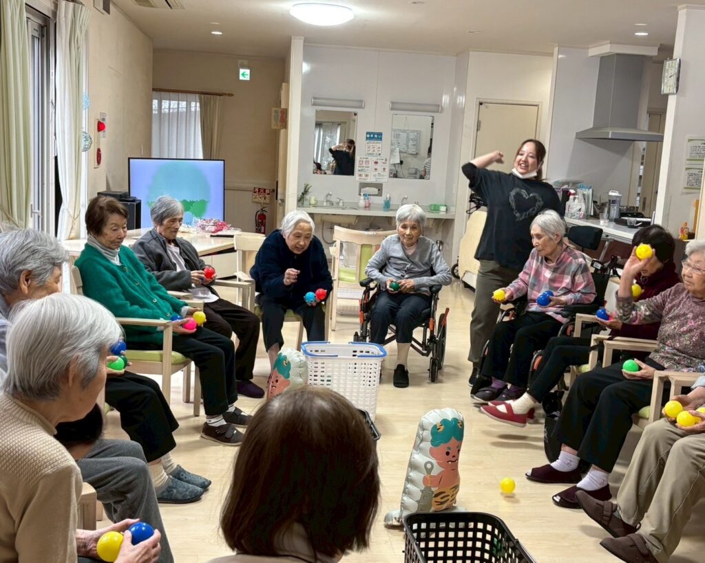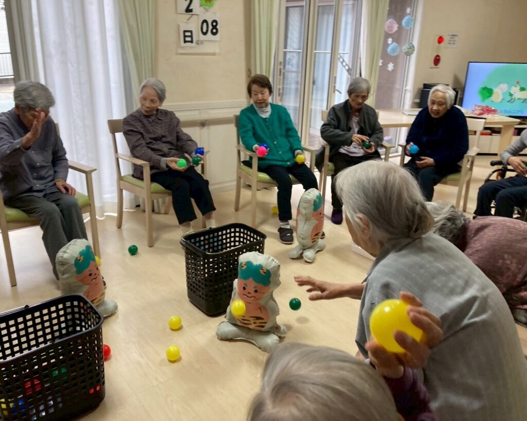 節分の豆知識や歴史のお話を聞き、鬼にボールを当てるゲームをして、