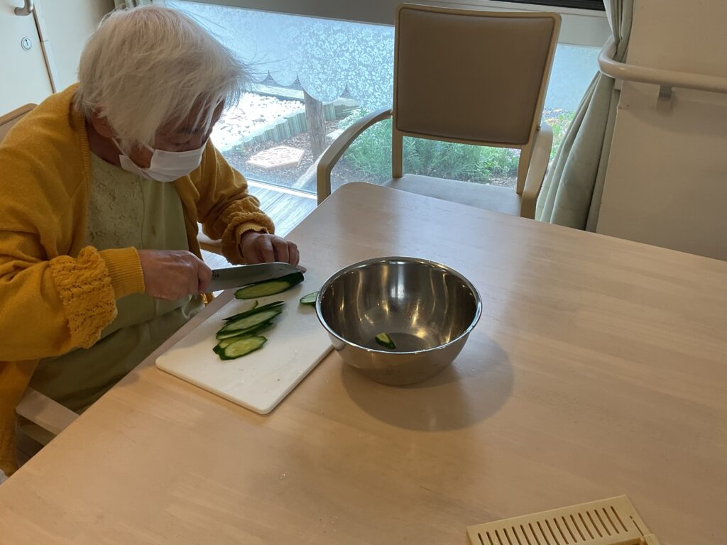 ゆで卵を剥いてマヨネーズと和えたり、キュウリを切ったり。